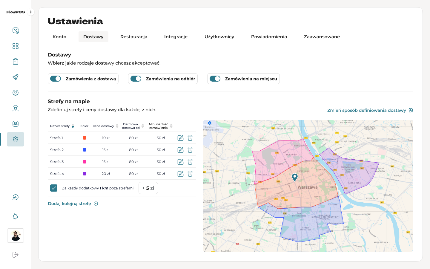 Ty decydujesz jakie formy zamówień przyjmujesz i w jakich strefach dostarczasz jedzenie.